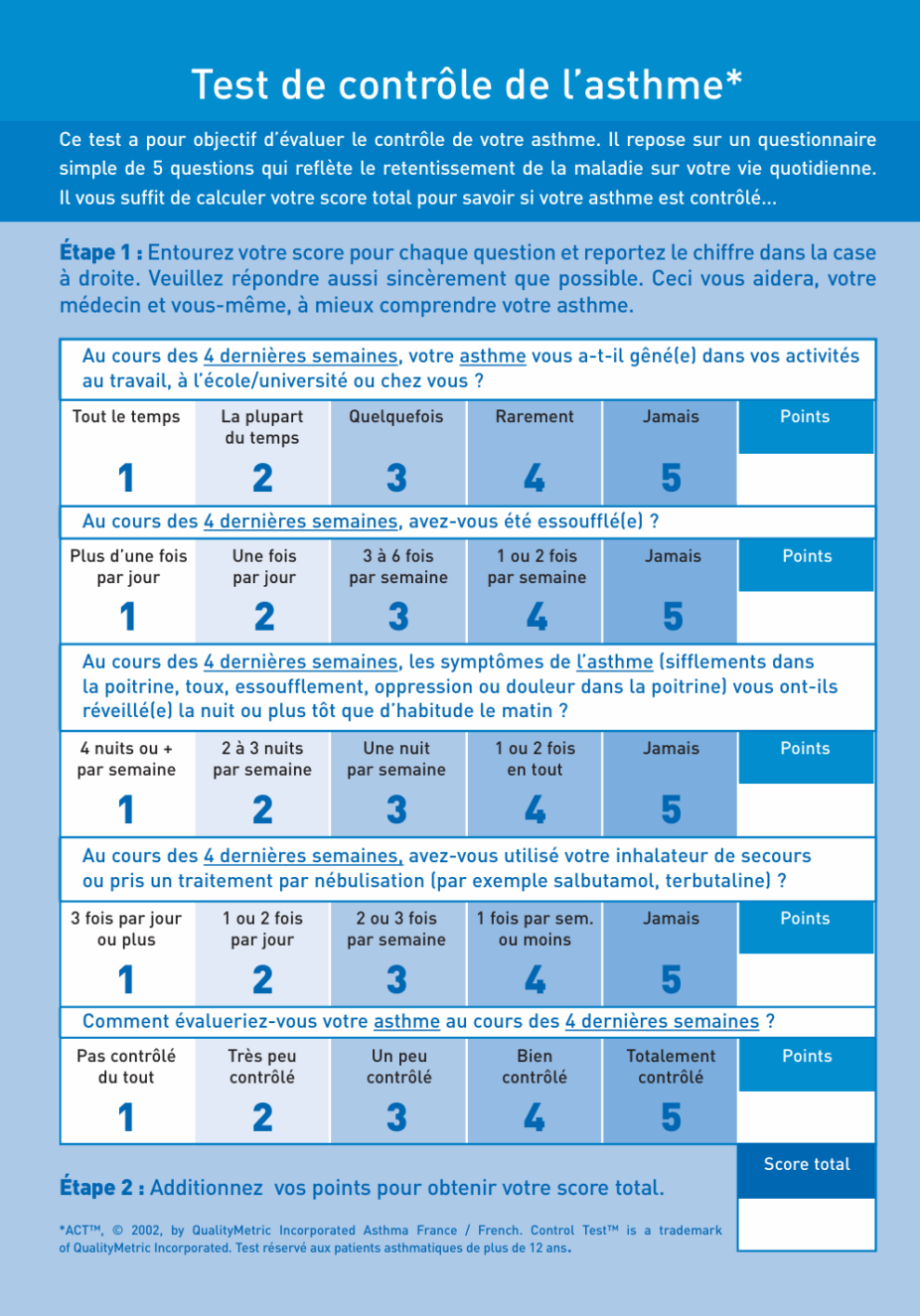 Le score ACT permet d’évaluer l’équilibre de l’asthme au cours des quatre dernières semaines. Il permet d’adapter le traitement.